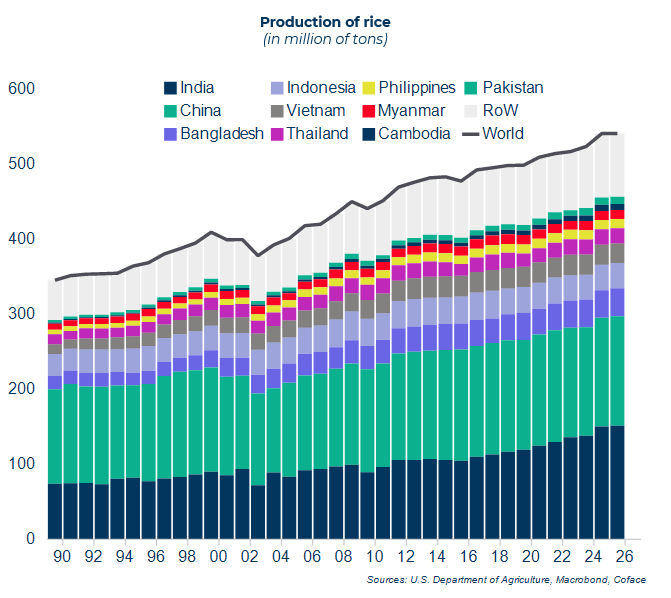 Desde 2022, India, el principal exportador mundial, había restringido sus ventas de exportación para contener el aumento de los precios mundiales (aumento del 19 % en 2022 y 2023) vinculado, en particular, a la guerra en Ucrania y a las malas condiciones meteorológicas en Asia. La reapertura de las exportaciones en 2024, junto con las cosechas récord en Asia, provocó una caída del 35 % en los precios en un año. Dadas las previsiones de aumento de la producción para 2026 y el posible regreso de La Niña en el cuarto trimestre de 2025, prevemos un creciente excedente de oferta en 2026. Se espera que los precios sigan cayendo al menos hasta finales de 2025, con una probable estabilización en 2026 a niveles no vistos en 10 años.