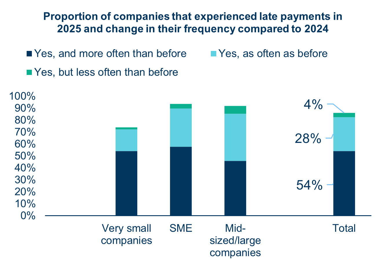 El 86 % de las empresas francesas afirman haber sufrido retrasos en los últimos 12 meses (frente al 82 % en 2023 y el 85 % en 2024). Este fenómeno afecta a todos los sectores, con una proporción especialmente elevada de microempresas: más de la mitad de ellas consideran ahora que el impacto en su flujo de caja es «crítico».